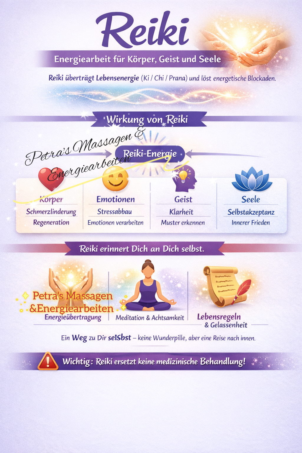 Wichtig!! Reiki ersetzt keine medizinische Behandlung. Es heilt keine physischen Verletzungen, kann aber den Heilungsprozess unterstützen, Kraft und Energie schenken und die Lebensqualität steigern. Kleine Wunder sind manchmal möglich, aber nicht garantiert.